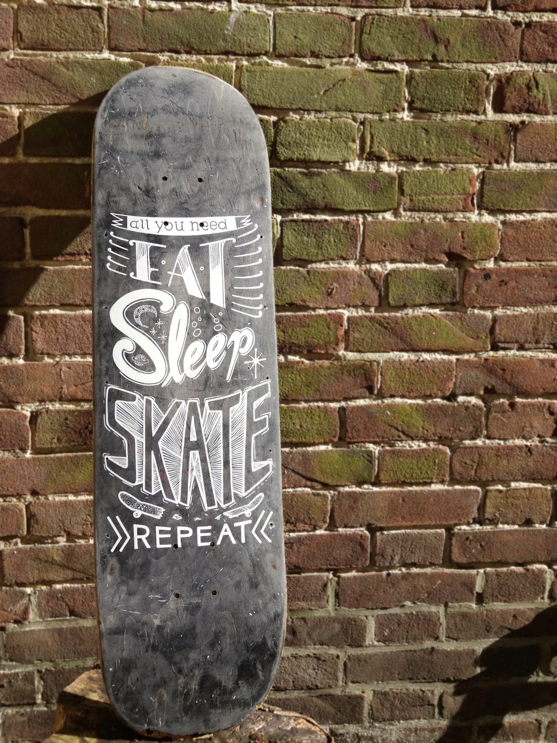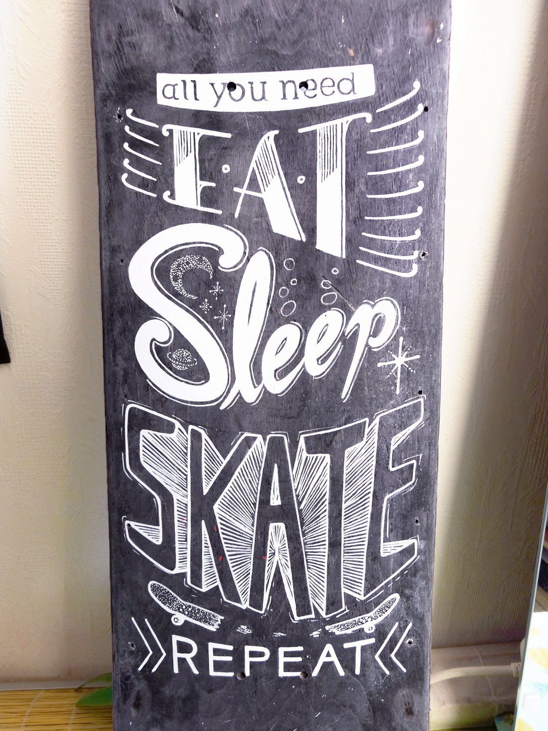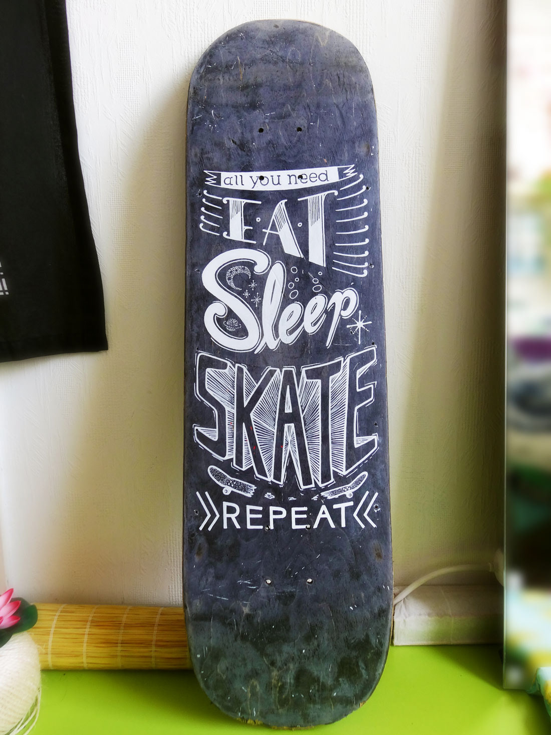 Project: Designing skate and surf board graphics on paper and digital is a lot of fun. But sometimes it doesn't seem quite fulfilling. If a design turns out really cool on the digital template, I can't wait to see it on actual boards. So I went to a skate park nearby and asked for a few used decks to sand off and paint on...